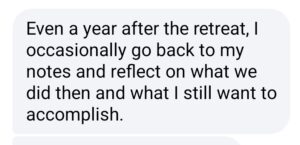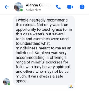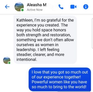 “Kathleen I can’t express my gratitude to you for thoughtfully and purposefully planning a powerful weekend at a beautiful venue. From the initial welcome at the coffee shop, to the sessions, discussions, journaling and the tearful, moving good-byes I am forever changed. Thanks so much to you and the beautiful, compassionate women I shared this with.” -NG